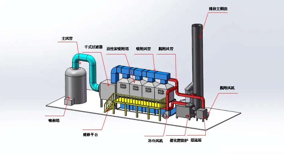 廢氣經收集、預處理后進入活性炭吸附裝置。氣體在活性炭床中停留很長時間。氣體中的揮發性有機化合物被吸附在活性炭表面。潔凈氣體從活性炭床排出后,可通過引風機直接排空。RCO處理后的清潔氣體經換熱至一定溫度后作為解吸空氣,經活性炭床解吸,從活性炭吸附裝置解吸出來的精礦進入RCO裝置,經貴金屬催化劑分解。分解溫度為200-250℃,廢氣被分解成二氧化碳和水,在利用。廢氣解吸分解完成后排入煙囪達標排放