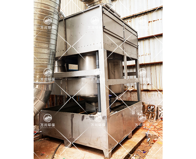 噴淋塔是一種效率高、壓力損失較低的除塵設(shè)備。廢氣正面切向進(jìn)入至內(nèi)部的噴淋層,通過水洗、噴淋、過濾后漆霧(在循環(huán)水中加入漆霧絮凝劑,使得油性漆霧在水中的溶解性更大)。